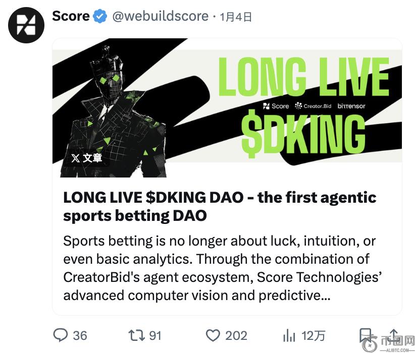 @thedkingdao 是**个自主体育** DAO,运行在 @webuildscore 子网 44(SN 44)上。