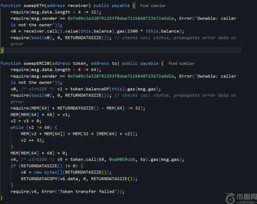 6. 升级后的恶意实现合约[ 16 ],包含了后门函数“sweepETH()”和“sweepERC 20()”,攻击者通过调用这些函数,转移了冷钱包内所有资产,**造成 14 亿美元的 ETH 被盗。