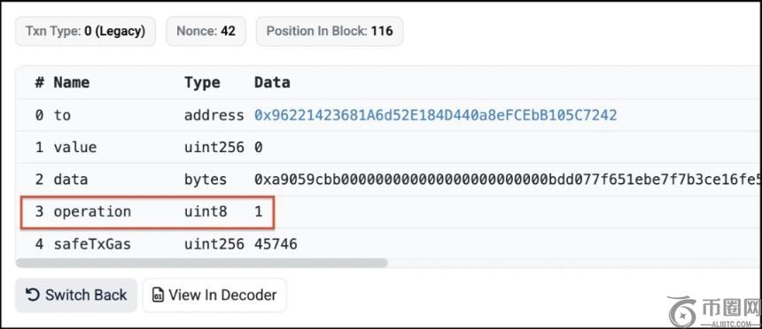 3. 攻击交易中的“operation”字段值为“ 1 ”,指示 GnosisSafe 合约执行“delegatecall”,而“ 0 ”表示“Call”。