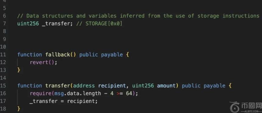4. 该交易执行了委托调用到攻击者部署的另一个合约(0x96221423681a6d52e184d440a8efcebb105c7242[ 15 ]),该合约包含一个“tran**er()”函数,调用时修改合约的**个存储槽“uint 256 _tran**er”。