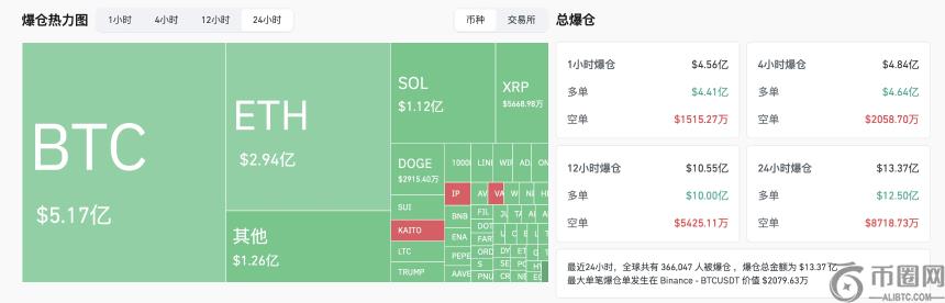 衍生品数据方面,Coinglass 数据显示,过去 24 小时**爆仓 13.37 亿美元,其中绝大部分为多单爆仓,数额达 12.5 亿美元。从币种来看,其中 BTC 爆仓 5.17 亿美元,ETH 爆仓 2.94 亿美元。