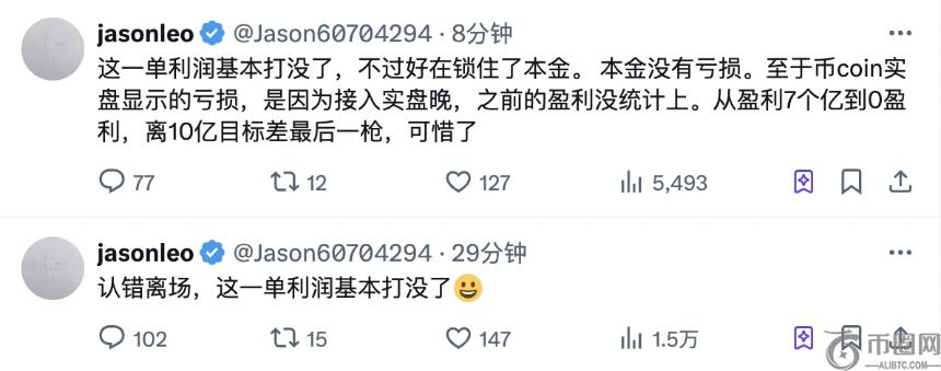 与此同时,疑似该大户本人的 X 用户 jasonleo 亦回应了该笔仓位的情况。jasonleo 承认了“认错离场,利润回吐”,但也澄清表示并未“亏损割肉,本金仍在”,因为实盘接入较晚,导致链上数据平台未统计上此前的盈利。