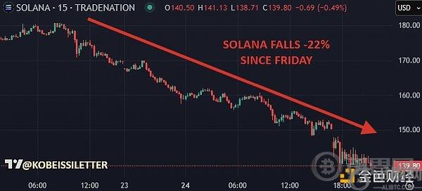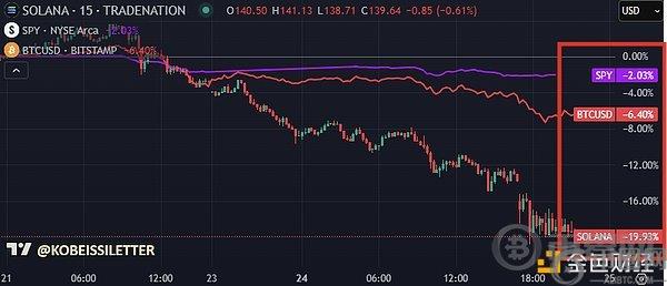 这一切似乎始于Solana,自上周五以来已下跌22%。在模因币热潮中,Solana表现出极强的相对强势。然而,随着模因币热潮消退,Solana也开始走弱。一段时间内,Solana的抛售与比特币基本无关。