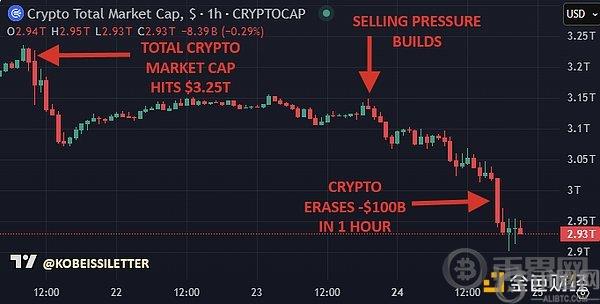 自上周五上午以来,加密货币市场市值已缩水3250亿美元。今天美国东部时间下午5点,加密货币市场在一小时内损失1000亿美元,期间没有**重大新闻。加密货币市场发生了什么?