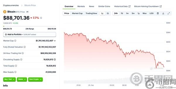 **数据显示,比特币跌幅进一步扩大,已来到8.9万美元下方。截至2月25日17时30分,比特币价格报88701美元,24小时内跌7.7%。以太坊、Solana、狗狗币等一众加密货币跌幅均超过10%。