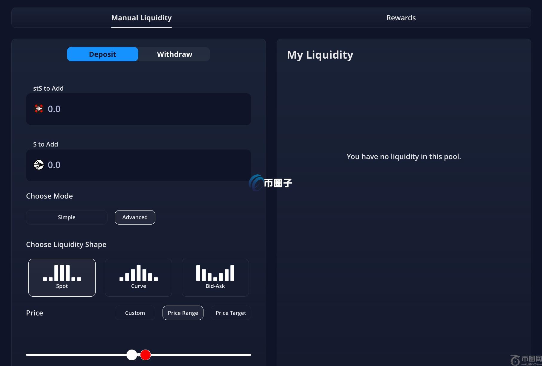 若选择Simple V2流动池,则只需将**存入即可;而若选择DLMM流动池,则可以点选管理(manage,图1)后,再点选进阶,以设定在特定的价格区间内提供流动性(图2)。可以参考官方的DLMM策略教学,获取更多提供流动性的见解。