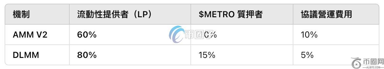 在「手续费分配」上,两种流动性机制也有差异,DLMM提供LP较高比例的手续费奖励,而AMM赋予$METRO质押者更高回报,详见下表: