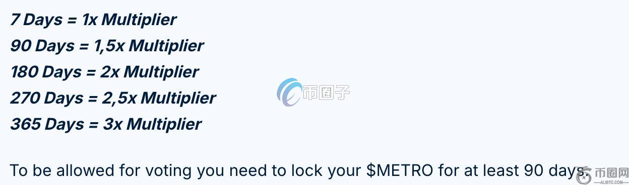 质押的锁仓期限为7至365天,对应不同的奖励乘数(详见下图)。要拥有投票权至少需锁仓90天,1$METRO等于1票,无论锁仓时间长短。