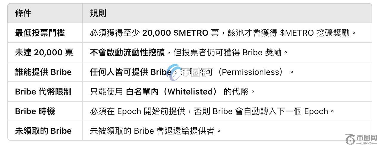 流动性池拥有者可透过Bribe(贿赂机制),激励$METRO质押者投票支持特定的流动性池,使该池获得$METRO奖励。这是$METRO质押者额外的收益来源。