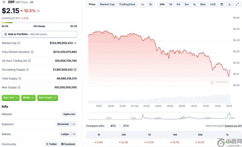加密货币市场今天2月25日(星期二)面临着重大的价格更正。比特币(BTC)已降至87,000美元的价格点。 BTC**一次在2024年11月以此水平交易。在过去的24小时内,全球加密市政上限下降了10.1%,至2.98万亿美元。 Ripple的XRP令牌也遵循市场更正。 XRP的价格在每日图表中下跌了12.3%,每周图表中的价格为17.2%,在14天的图表中的价格为13.7%,上个月比上个月31.1%。尽管进行了大规模的校正,但自2024年2月以来,XRP还是达到了292.9%。