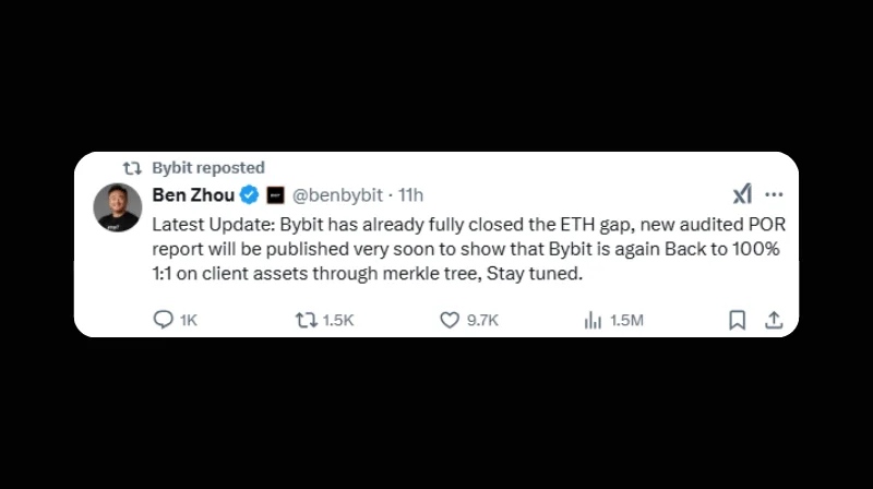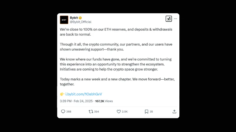 Bybit还从外部来源获得了40亿美元的流动性支持,其中包括63,168 ETH(约1.7亿美元),31.5亿美元,1.73亿美元,1.73亿美元,5.25亿美元的CUSD以及BINANCE,BI**ET,BI**ET和MEXC的转移。结果,Bybit已**重新开放所有存款和提款服务。