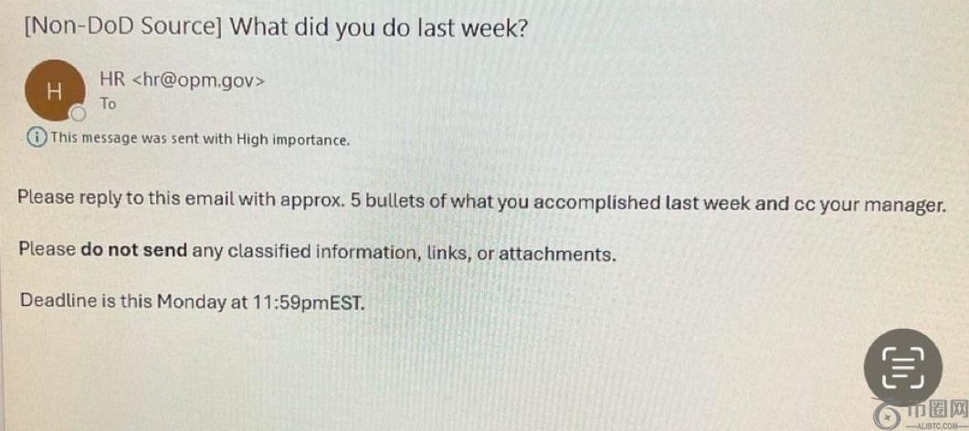 该电子邮件要求员工在5个项目符号中解释他们“上周取得的成就”。它还提到不要“发送**分类信息,链接或附件”。该电子邮件本身没有终止或辞职的警告,但在美国东部标准时间11:59设定了截止日期。