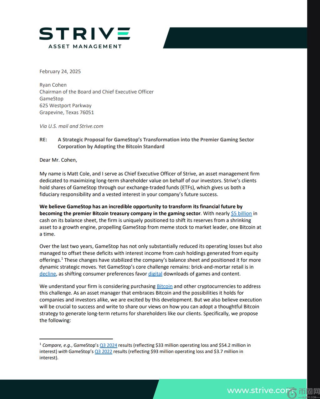 马特·科尔(Matt Cole)在信中说:“由于投机性的替代方案可以**GameStop的财务稳定性,并有可能损害您提高未来融资的能力,其中包括以下第4节中概述的比特币融资策略,将财政资源分配给比特币风险稀释股东价值的加密货币。”