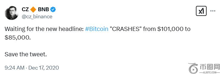特别是,CZ预测2020年12月,当时比特币的交易约为19,000美元,资产可能达到101,000美元,可能会降至85,000美元左右。但是,他建议下降到85,000美元可能会引发看跌头条新闻,这表明尽管BTC的交易价格远高于2020年,但情绪仍会减少。