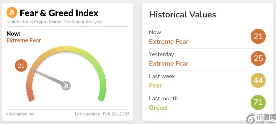 预计,在市场动荡,加密恐惧和贪婪指数(GPI)中,一种测量加密投资者情绪的工具,昨天2月25日跌至25个月,这是五个月来的**次。对于上下文,索引读取为0到100,较低的值表示看跌情感。