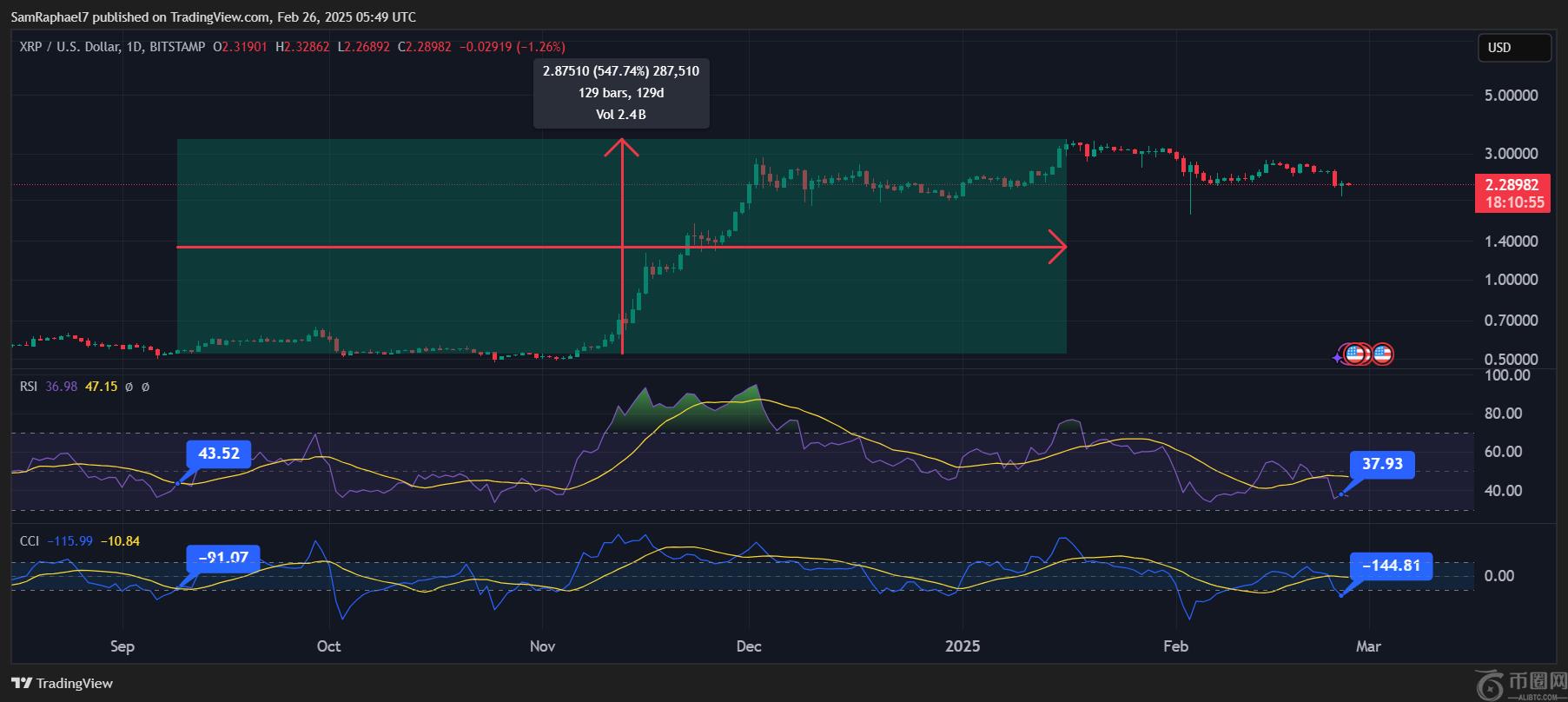 此外,仔细查看每日图表表明,两个势头指标的相对强度指数(RSI)和商品渠道指数(CCI)的位置比去年9月更为看涨。这增强了XRP上升趋势的机会。