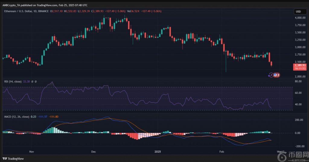 ETH的当前技术指标为以太坊买家提供了混合图片。 Ethereum的RSI为33.30,接近领土但尚未达到极低的低点,这表明仍然存在潜在的下行风险。 MACD直方图在短期内翻转了负面的,增强了看跌势头。