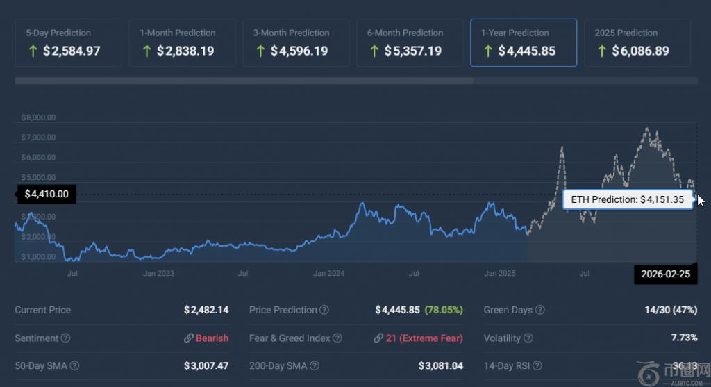 ”根据我们目前的以太坊价格预测,预计到2026年2月26日到2月26日,以太坊的价格预计将上涨78.05%,达到4,445.85美元。根据我们的技术指标,当前的情感是看跌,而恐惧和贪婪指数则显示21(21(极端恐惧)。以太坊记录了14/30(47%)的绿色日,最近30天的价格波动为7.73%。根据以太坊的预测,现在是购买以太坊的糟糕时期。”