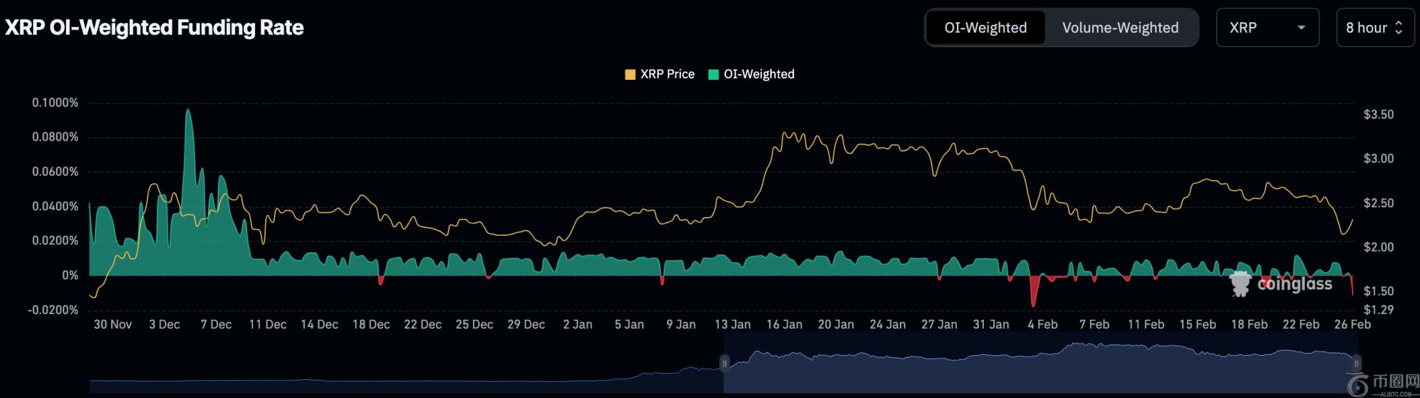 在其他地方,XRP的开放利息加权融资率是重要的市场情感指标,变成负面。在整个1月和2月的大部分时间里,资金率仍然是积极的。但是,最近的数据显示了变化,红色条形信号看跌情绪。