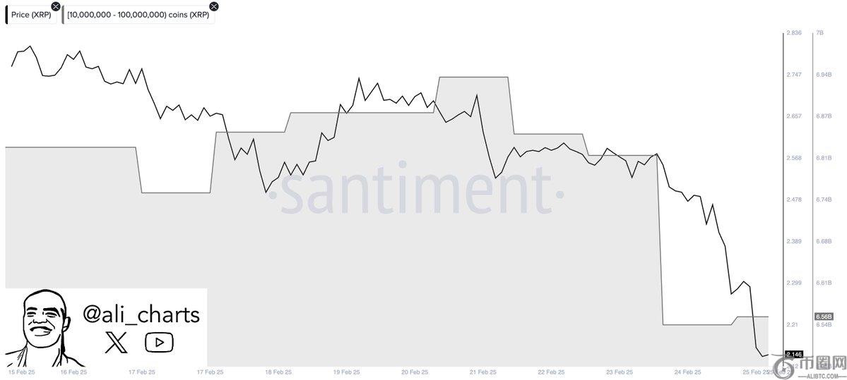 同时,在XRP价格下跌中,市场数据表明急剧下降XRP鲸鱼持有。在鸣叫,阿里·马丁内斯(Ali Martinez)强调,持有1000万至1亿XRP的钱包减少了其投资组合。