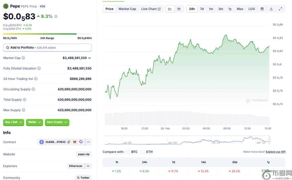 Pepe目前比其历史**高点的0.00002803下降了70%以上。资产于2024年12月达到**。