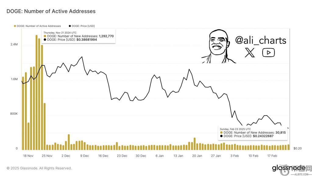 随着价格,Dogecoin的网络活动也受到了打击。阿里·马丁内斯(Ali Martinez)策划的**数据表明,网络上的活动地址数量减少了95%。这些数字从11月的266万增加到今天的130,282。