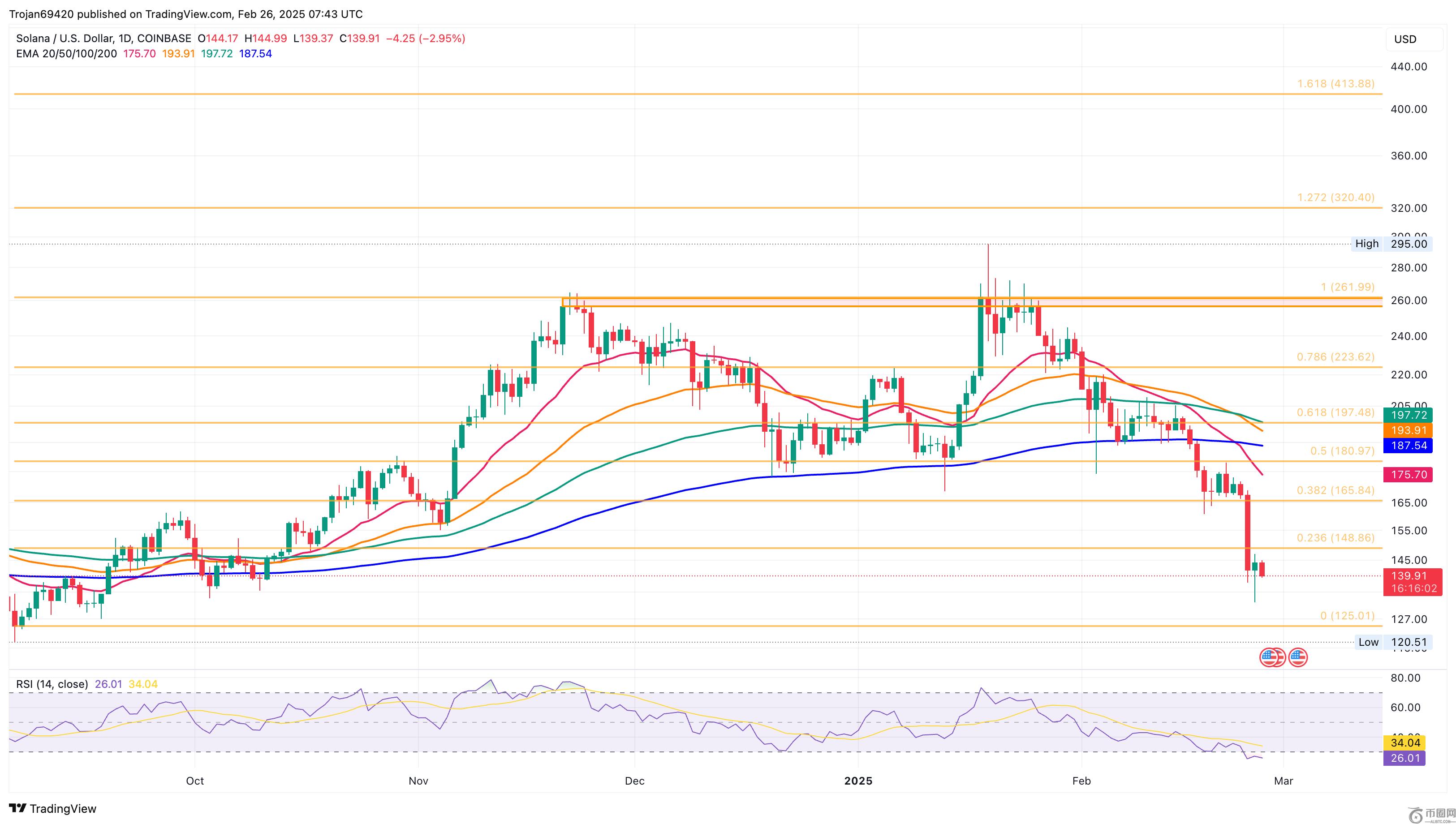 由于加密市政上限总额降至2.87万亿美元,Altcoins正在努力寻找关键的支持。在市场状况下降的情况下Solana交易低于140美元。