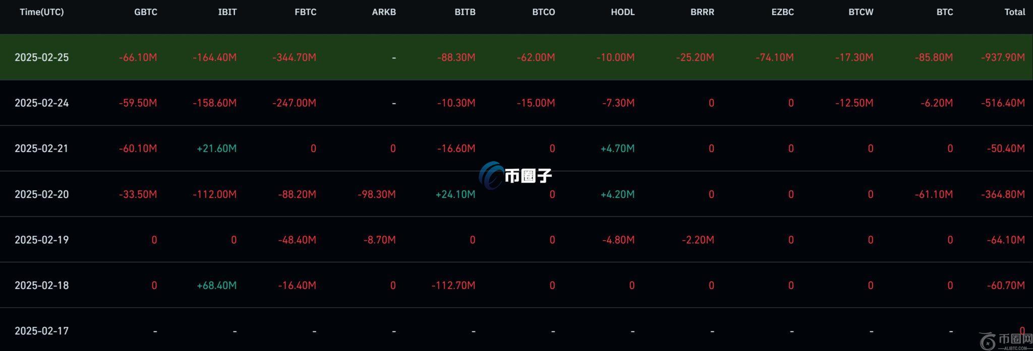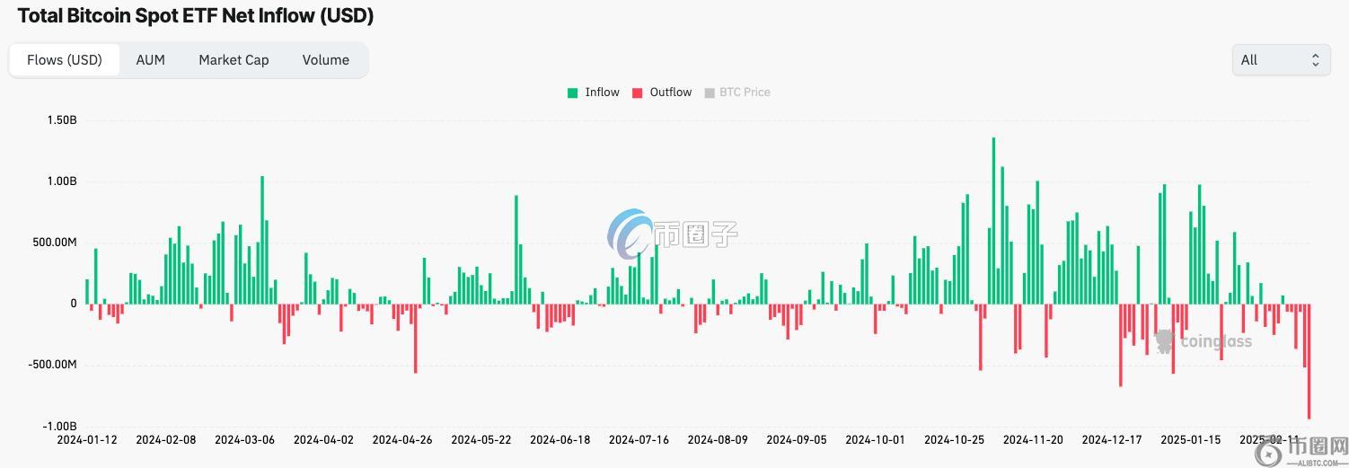 币圈网(Alibtc.com):在**关税战的疑虑下,加密货币市场本周惨崩,比特币25日最深一度跌破8.7万美元,在出现此剧烈波动之际,据CoinGlass数据,11档比特币现货ETF25日总计净流出9.379亿美元,创下史上**单日净流出,同时也是连续第6个交易日出现资金外流。