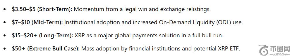 XRP的按照案件的胜利,XRP的目标范围可能为$ 3- $ 5。该平台预测中期的增长至10美元,这可能会因其机构使用的增加而引起。如果**将**点作为全球付款解决方案,则可能会达到15至20美元。如果大规模收养****,金融机构包含XRP ETF,则**甚至可以针对50美元。