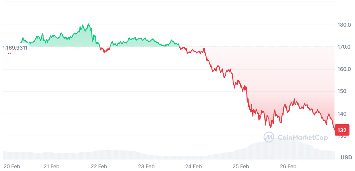 由于网络上的交易活动放缓,Solana的价格远低于其历史**高高的50%以上。周二的某一时刻,索拉纳(Solana)的交易价格为132美元,但随后略有反弹至139美元,在发稿时再次下跌至132美元。