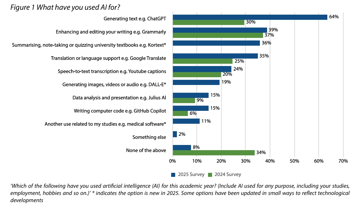 高等教育政策研究所(电话)的2025年调查发现,使用AI的学生人数已从2024年的66%急剧上升到今年的92%。人工智能在教育中的使用迅速增加促使大学重新评估其教学和学习策略。