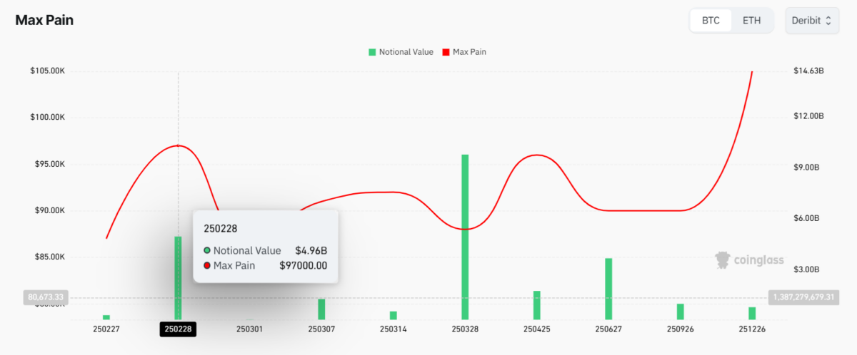 与BTC一起,价值为1.24B美元的以太坊期权将于2月28日到期。期权的**痛苦价格为3,000美元,这一水平在接下来的几天可能很难达到。