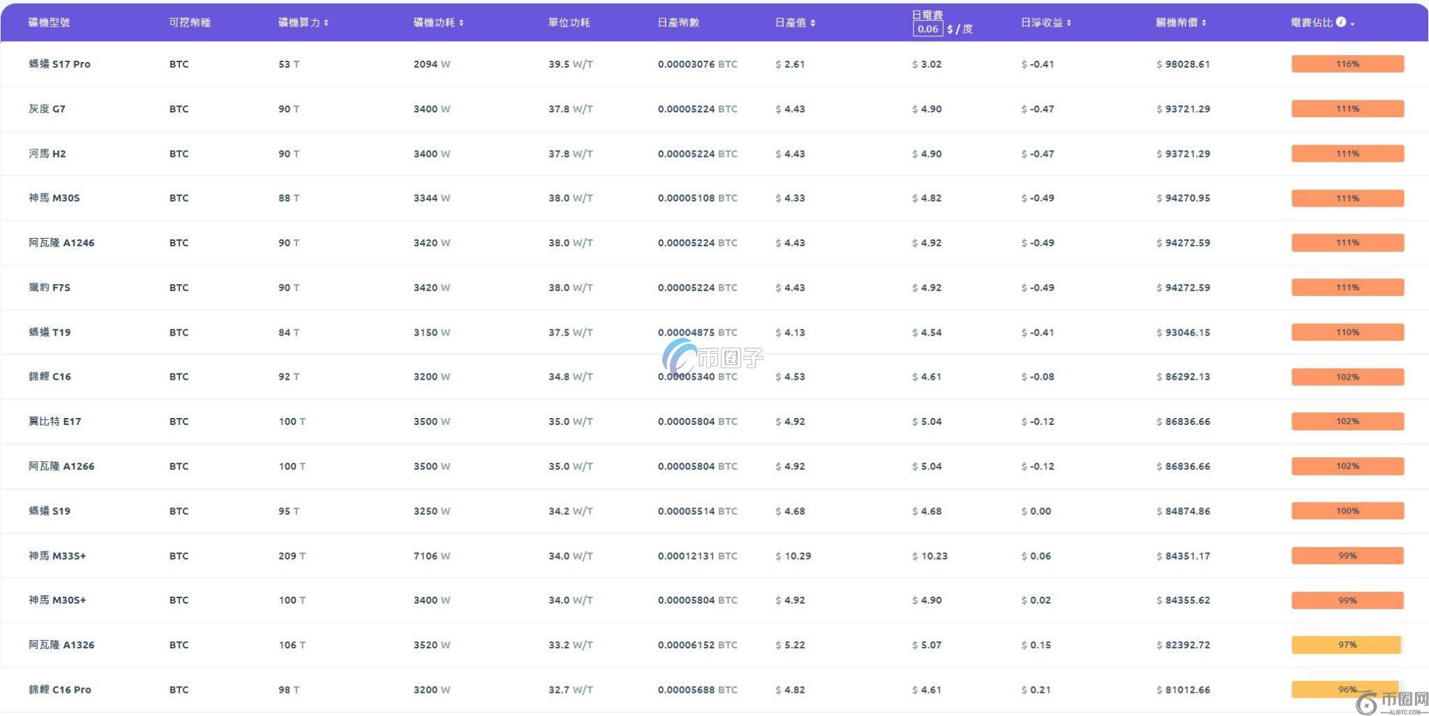 目前仍有盈利空间的67款矿机中,有16款矿机的电费占比已超过60%,其中,神马M33 S 、神马M30 S 的电费占比高达99%,蚂蚁S19的电费占比则达到100%,处于盈亏平衡点。