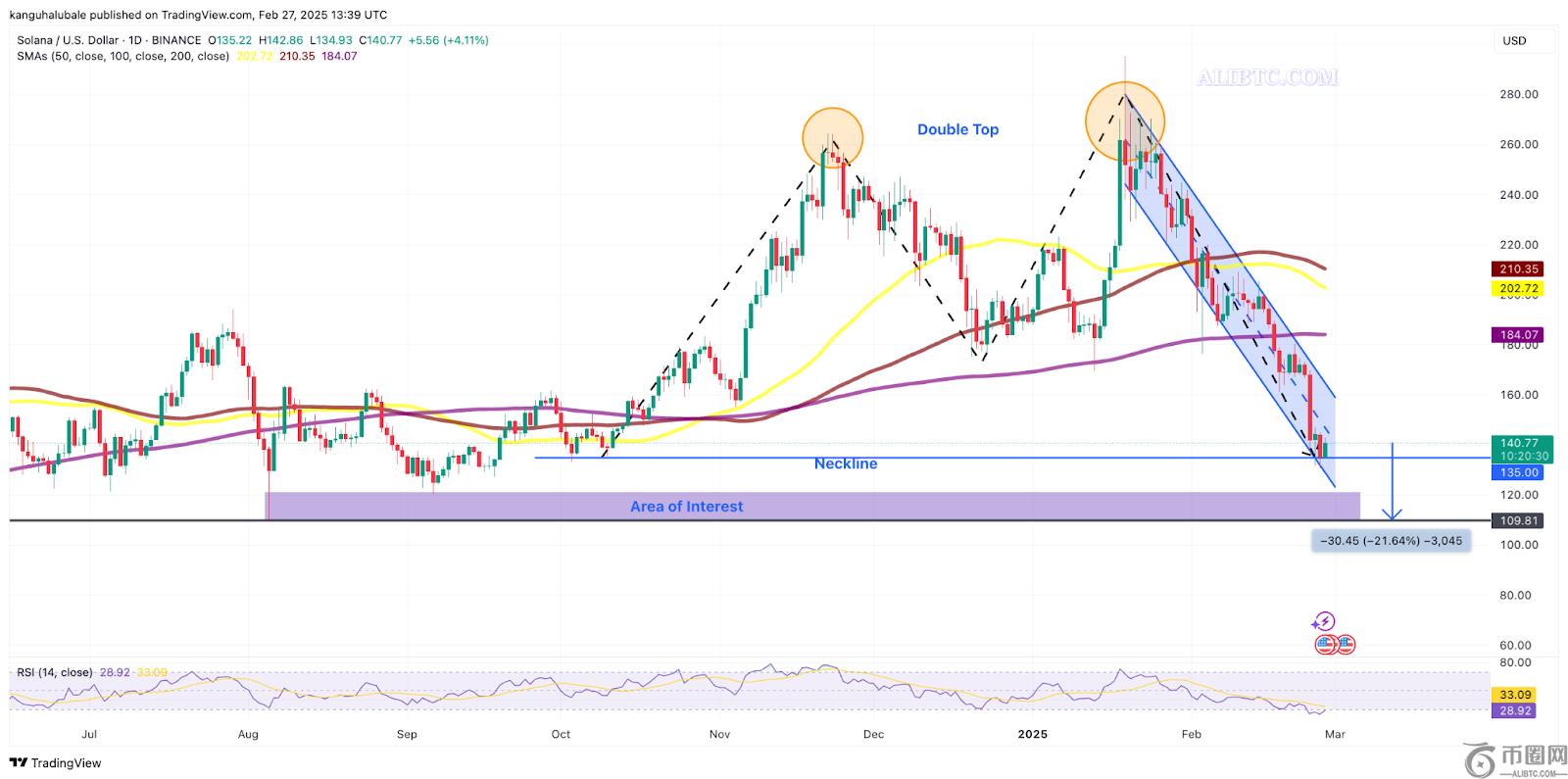 SOL 价格有望进一步下跌 20%,从技术角度来看,SOL 的价格走势已完成双顶模式,如下面的日线图所示。现在的问题是 Solana 能跌到多低?