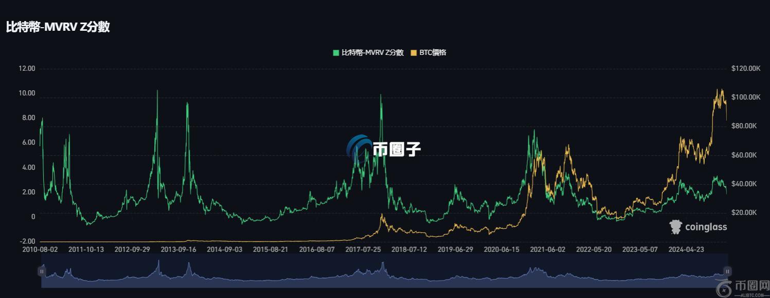 据Coinglass数据显示,当前比特币的MVRVZ分数,为2.06,相较于此前比特币在阶段顶部时的MVRVZ分数,有明显下降,不过距离去年中多个月的盘整分数还有一小段距离。