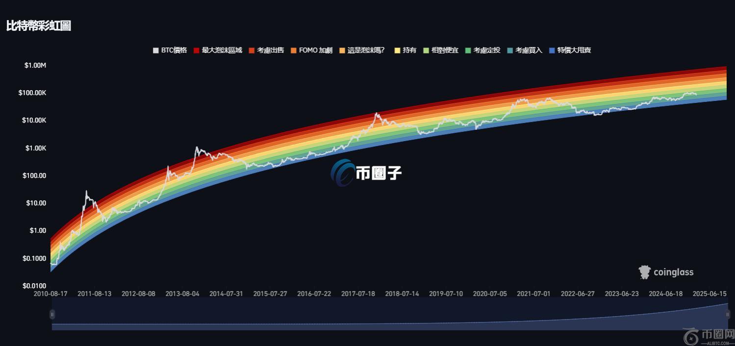 据Coinglass数据显示,当前比特币彩虹图所在位置在绿**间,或许暗示着可能被市场低估。