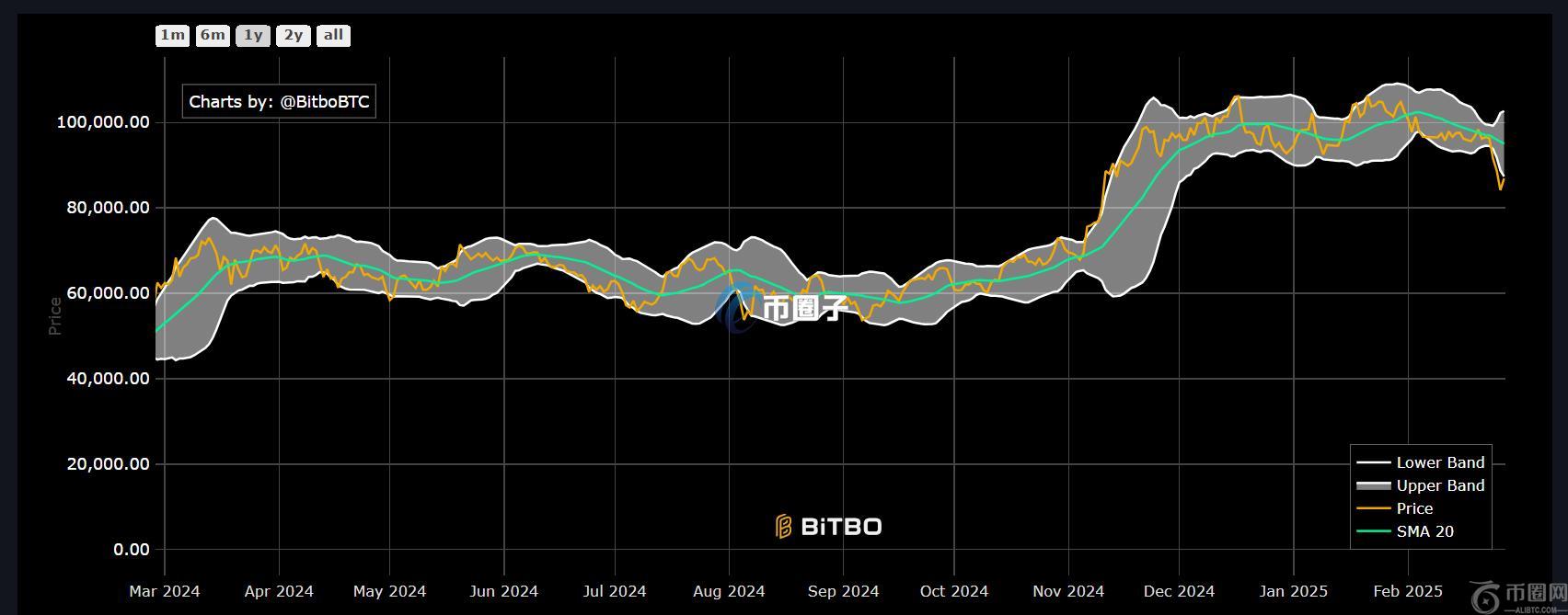据Bitbo数据显示,当前布林通道在收窄的同时,比特币的价格也触及布林通道下轨,可能暗示市场处于底部。