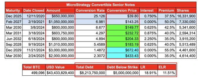 • MicroStrategy 目前的总债务约为 82 亿美元,主要是可转换债券,票息较低,部分甚至为 0% 。