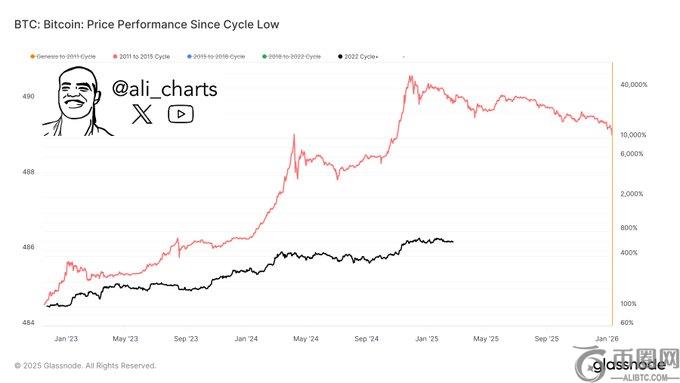 “如果比特币遵循2015-2018周期,这可能会暗示市场上方仍有更大的增长空间!”