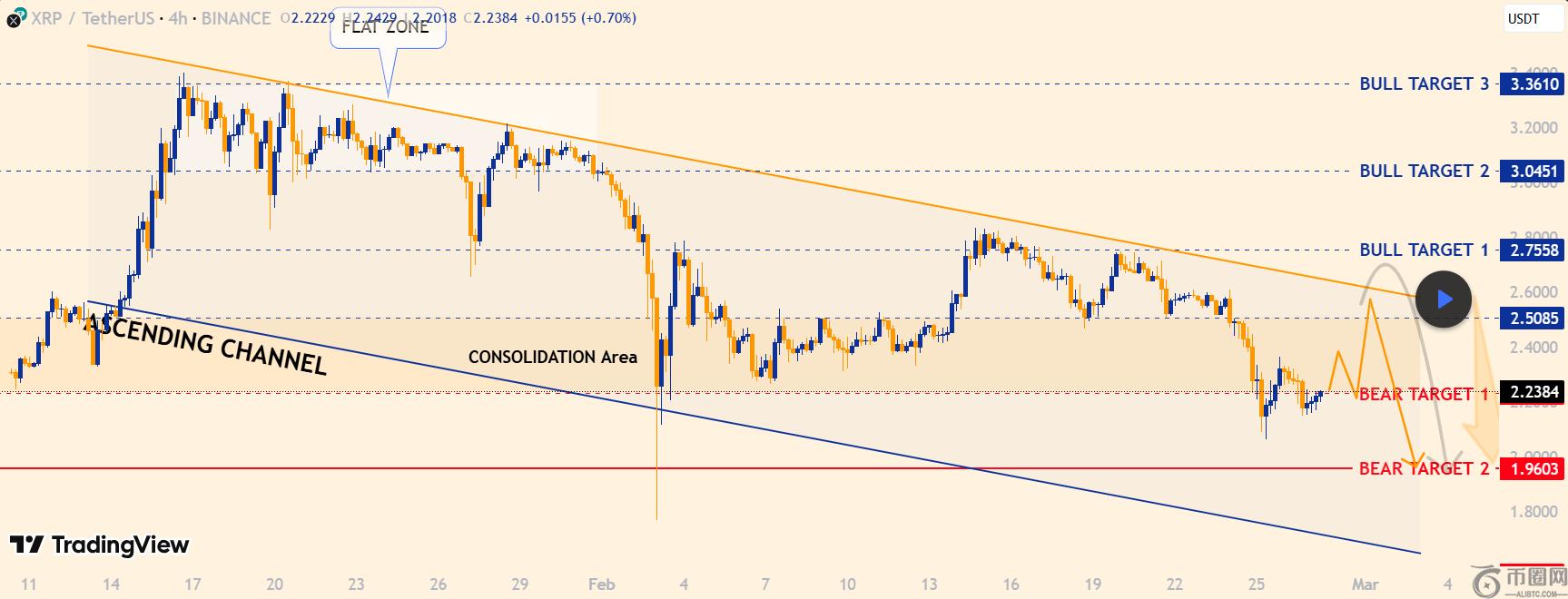在这个关键时刻,市场分析师Arina Karayi在TradingView中提出了XRP的三个看跌目标分析。有趣的是,该资产似乎已经以2.23美元的价格移至**个看跌目标以下。熊队在2月26日(星期三)果断地重新确定了这一水平。