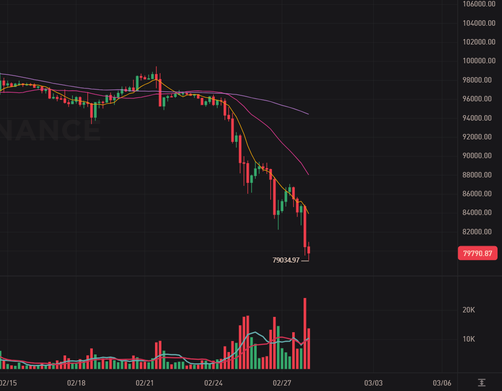 他这么说的时候,比特币刚刚跌破 9 万(2 月 25 日),2 天后(2 月 27 日)比特币的价格再次跌破 8.5 万,今天(2 月 28 日)再次跌到了 8 万以下,似乎**呼应了 Schaaf 的观点。