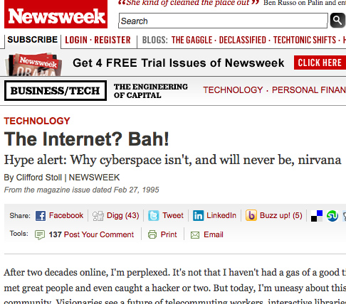 今天的标题,模仿自 30 年前美国《新闻周刊》的一篇文章《互联网?呸!》(The Internet?Bah!)。