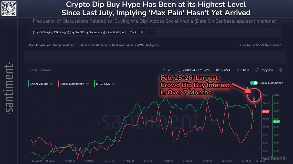 单人指出,社交媒体提到“ Buy The Dip”的社交媒体上升到了2024年7月以来的**水平。社交媒体提到“购买蘸酱”的兴起,但炒作不**反映在市场上。该平台敦促人们“寻求乐观的衰落,并以看涨的信号为单调的倾斜呼叫。”