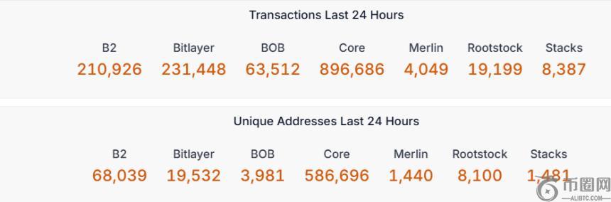 Signal21还确认了L2叙事,并挑出了最成功的项目。其中包括Core、B2、Bit Layerer、Bob、Merlin、Rootstock和Stacks。其中,Core在一些最活跃的时期超过了896,000笔交易,成为领导者。