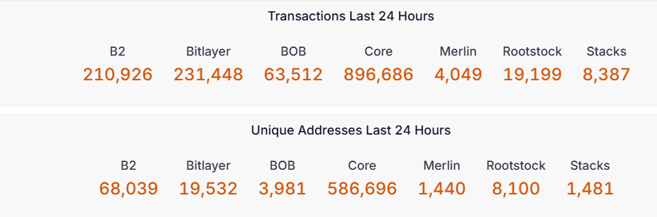 信号21还确认了L2叙事,并挑出了最成功的项目。其中包括Core,B2,Bit Layerer,Bob,Merlin,rootstock和Stacks。核心是其在某些最活跃的时期超过896K交易的领导者。