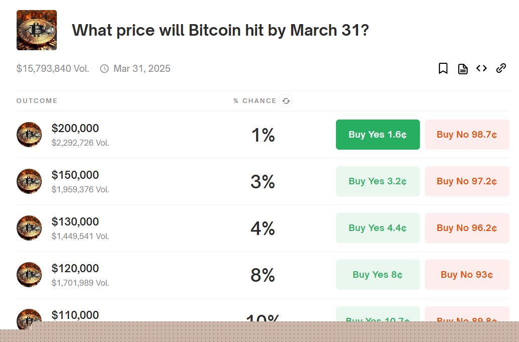 正如前面指出的那样,比特币正处于危机中。根据链数据,比特币目前的交易价格为84,113美元,一周中下跌14.4%。好吧,多聚市场交易者考虑了另一个想法。到3月底,比特币的预测和赌注将达到200万美元。