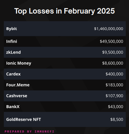 尽管经常是加密黑客的**目标,但2025年2月的分散融资(DEFI)平台却见证了集中式融资(CEFI)服务的增加。 免疫,在其中 报告,解释说,CEFI通过BYBIT的黑客攻击了2月损失的95.5%。 同时,DeFi遇到了八个单独的骇客,仅占本月损失的4.5%。