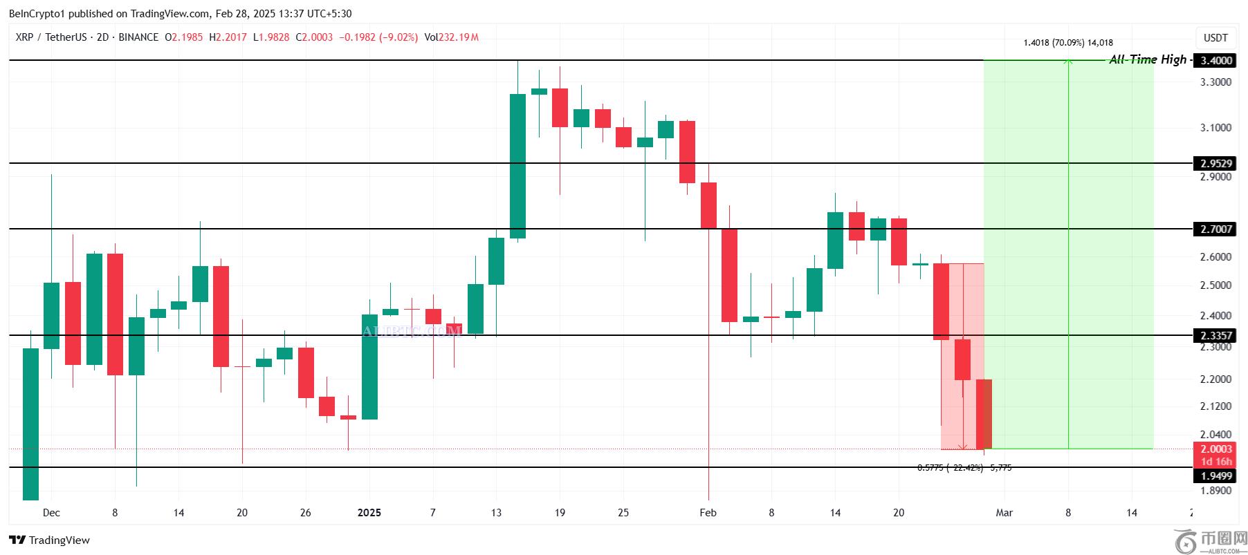 XRP 价格目前为 2.00 美元,远低于其历史很高价 (ATH) 3.40 美元。要达到 ATH,XRP 需要上涨 70%。过去一周内最近 22% 的下跌使山寨币进一步偏离了之前的上涨势头,引发了人们的担忧。