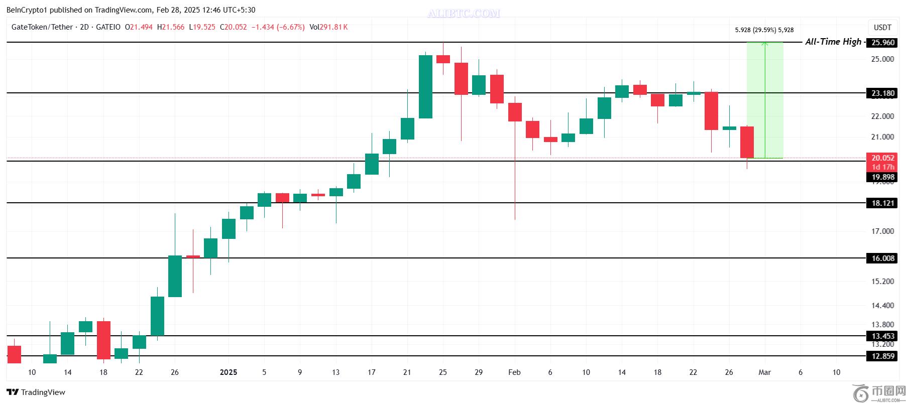 如果看跌趋势持续,GT 价格可能会跌破 19.89 美元的支撑位。这将使看涨前景失效,并将山寨币推向下一个支撑位 18.12 美元或更低。如果市场情绪仍然消极,这种进一步的下跌意味着 GT 可能会面临更大的损失。