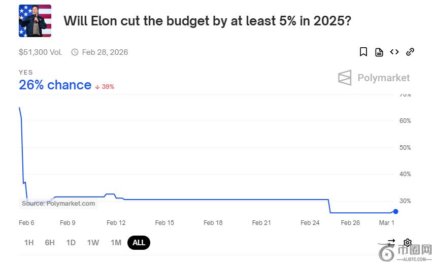 根据Polymarket的预测,Musk的削减幅度不太可能发生,因为74%的赌注预测了这一点。